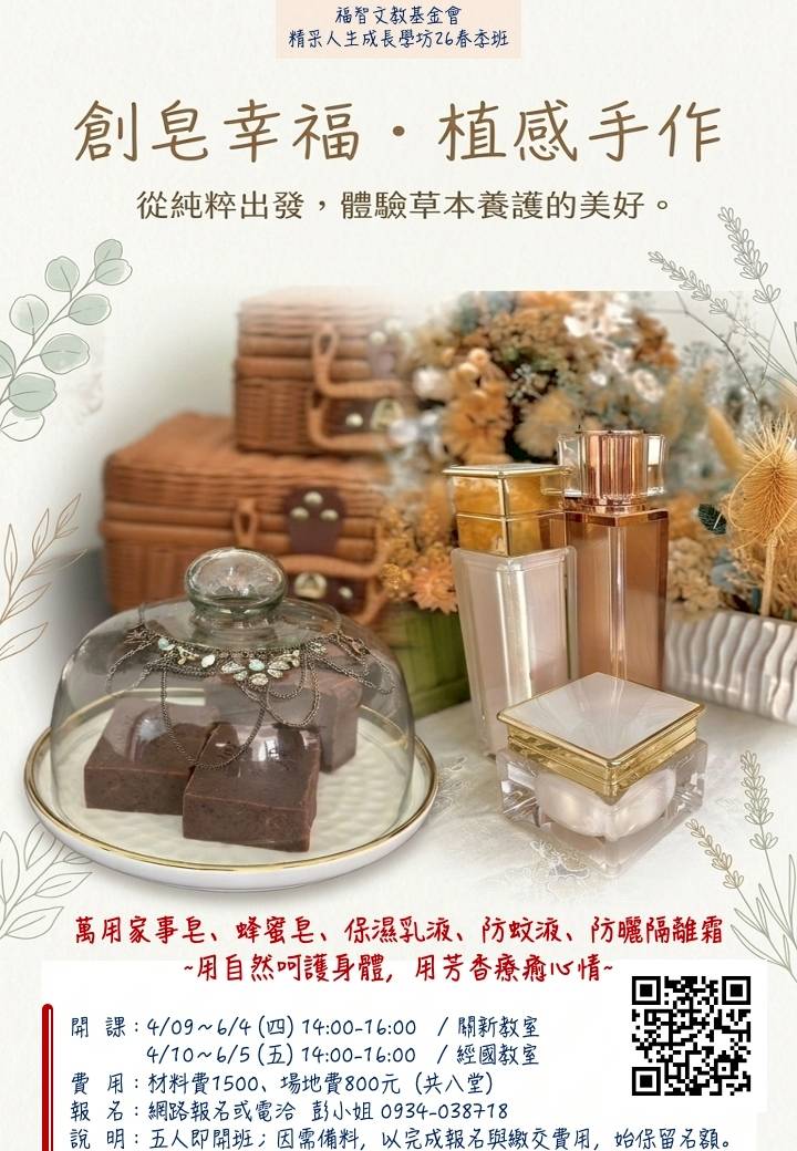 - 小班制,五人即開課,並請加入【26春_創皂幸福。植感手作】群組,開課前會通知。