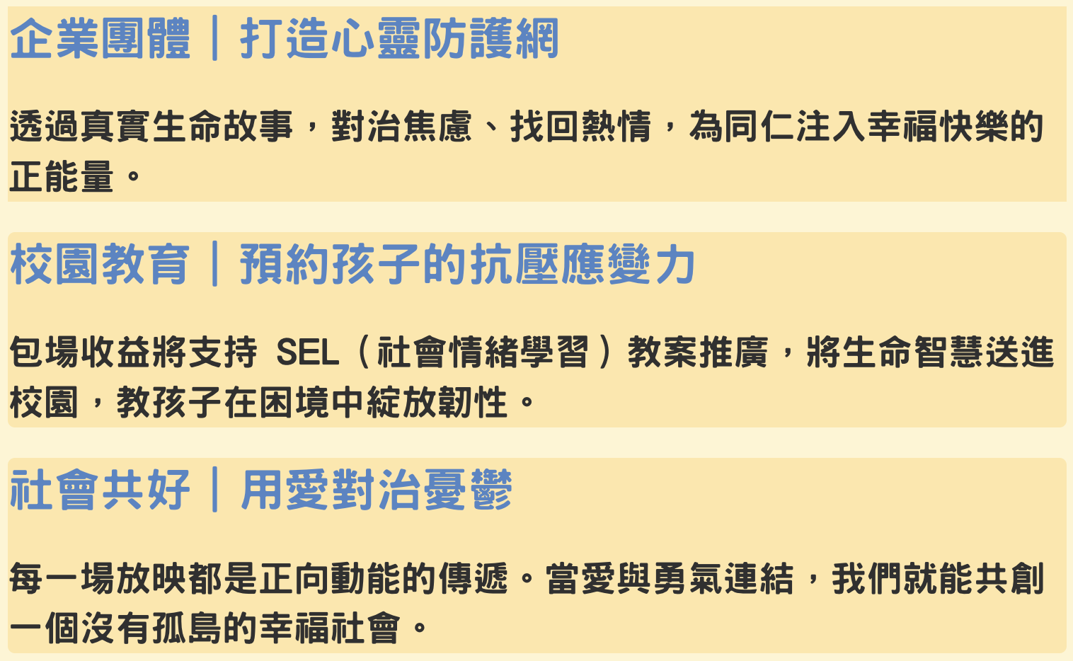 簡介 2025 年度紀錄片 “「所謂超人,不是沒有脆弱的人,而是願意超越自我,並帶著他人走向光的人。」” 揪團包場當超人!集結愛的力量,點亮社會的幸福微光~ 福智文教基金會與美力台灣3D協會誠摯邀請您,參與年度最感人的紀錄片《超人再起》包場行動。 這不只是一場電影,更是一場守護心靈、改變台灣的集體實踐。 為什麼選擇包場? 🌟 三大影響力: 現在就行動,成為點亮希望的人! 一個人可以被感動,一群人才能改變世界。 《超人再起》,我們戲院見! ❤️