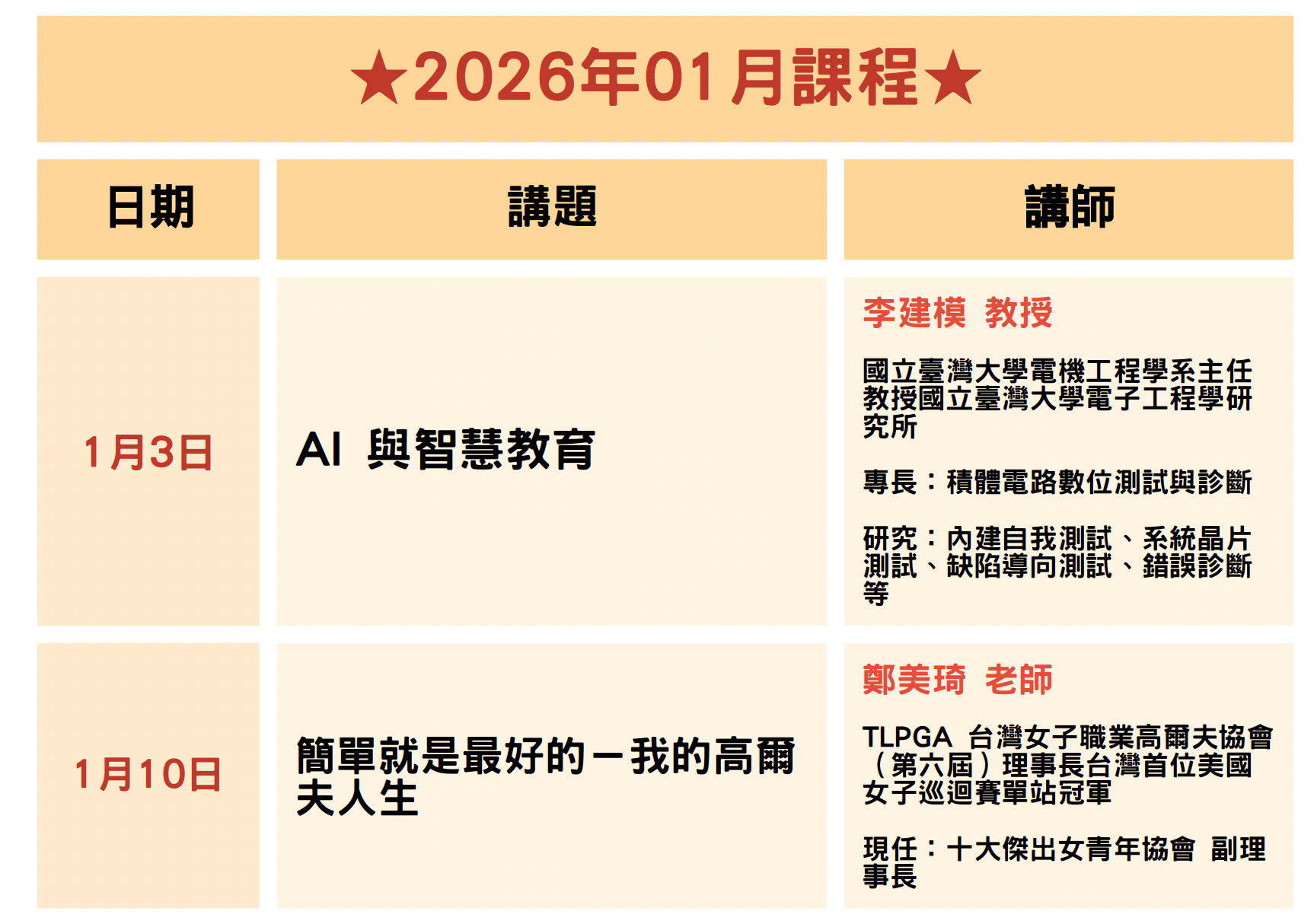 我們邀請來自各領域的講者,包括學界教授、企業領導、醫療與養生專家、職業高爾夫名將、心靈成長老師,帶來豐富又真誠的分享,讓每一次相聚都充滿收穫。