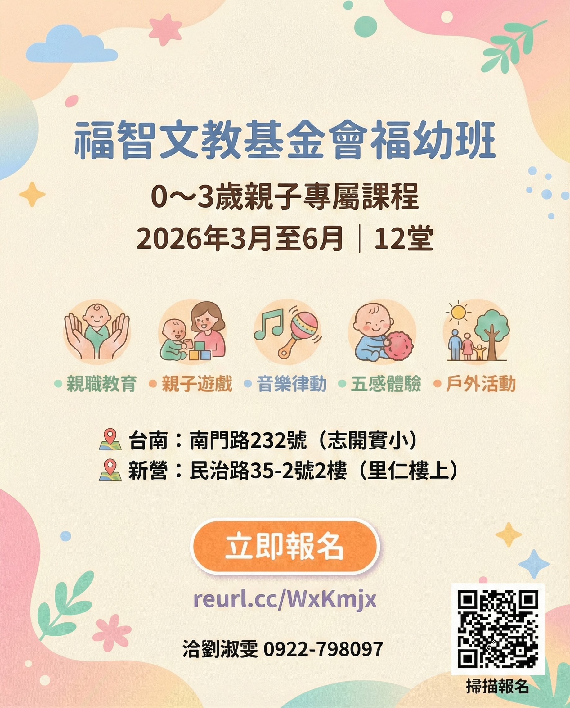 2. 週四 新營福幼班:新營區民治路35-2號2樓 (里仁商店樓上)