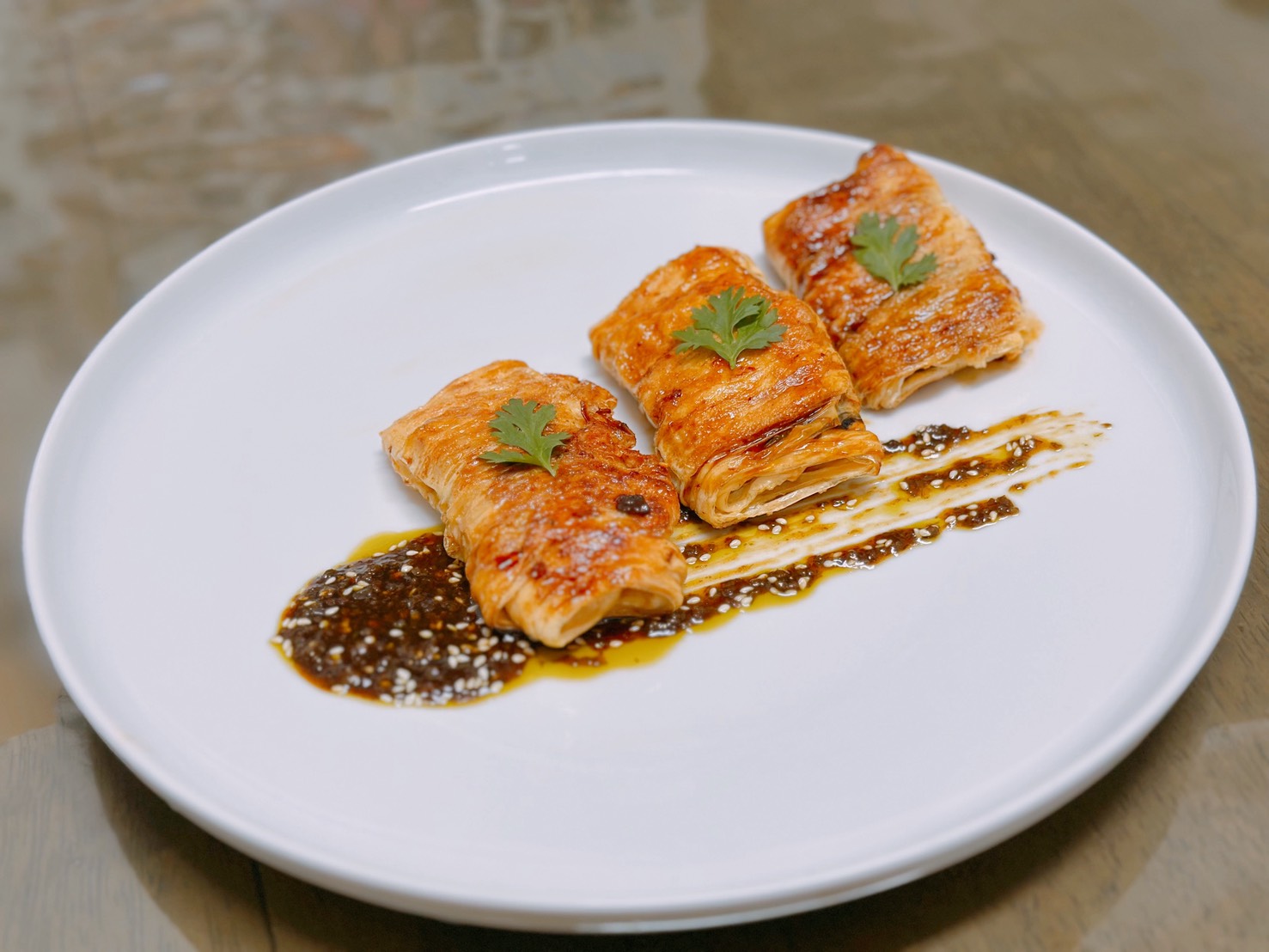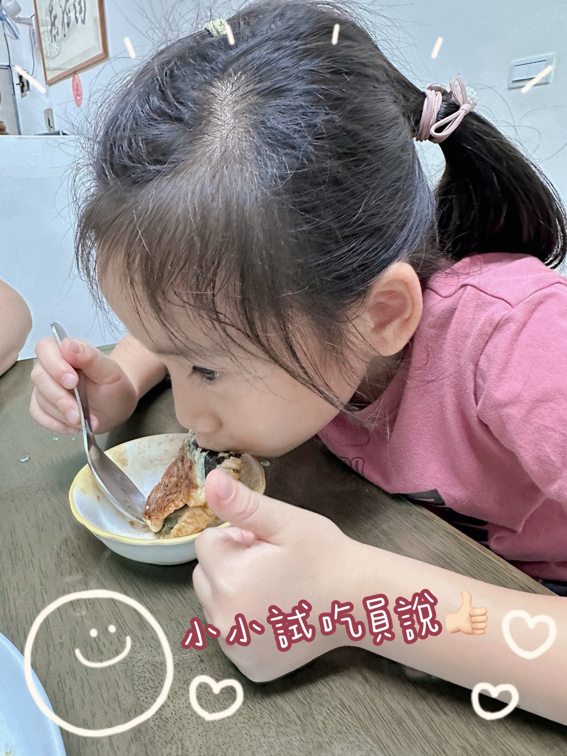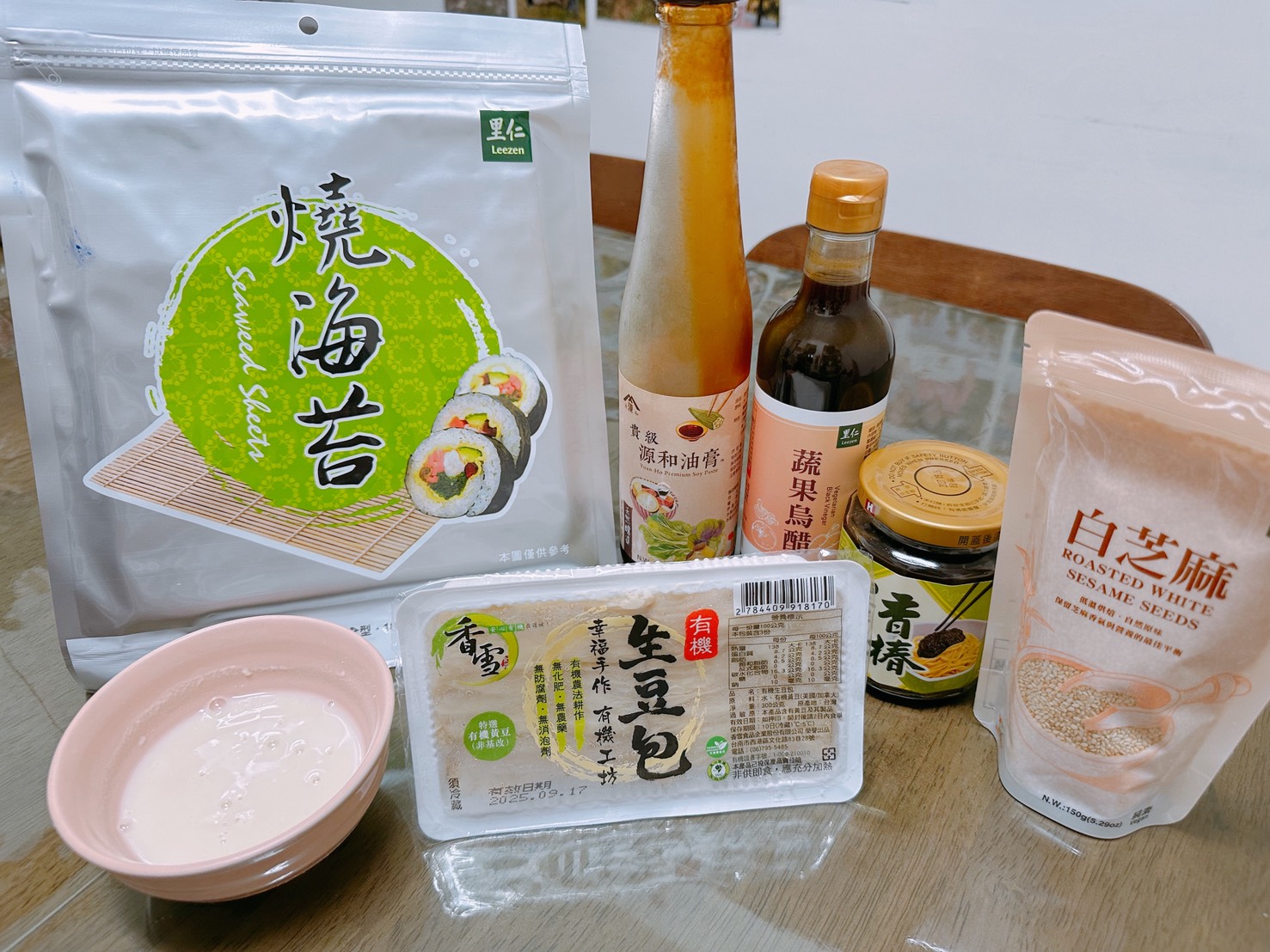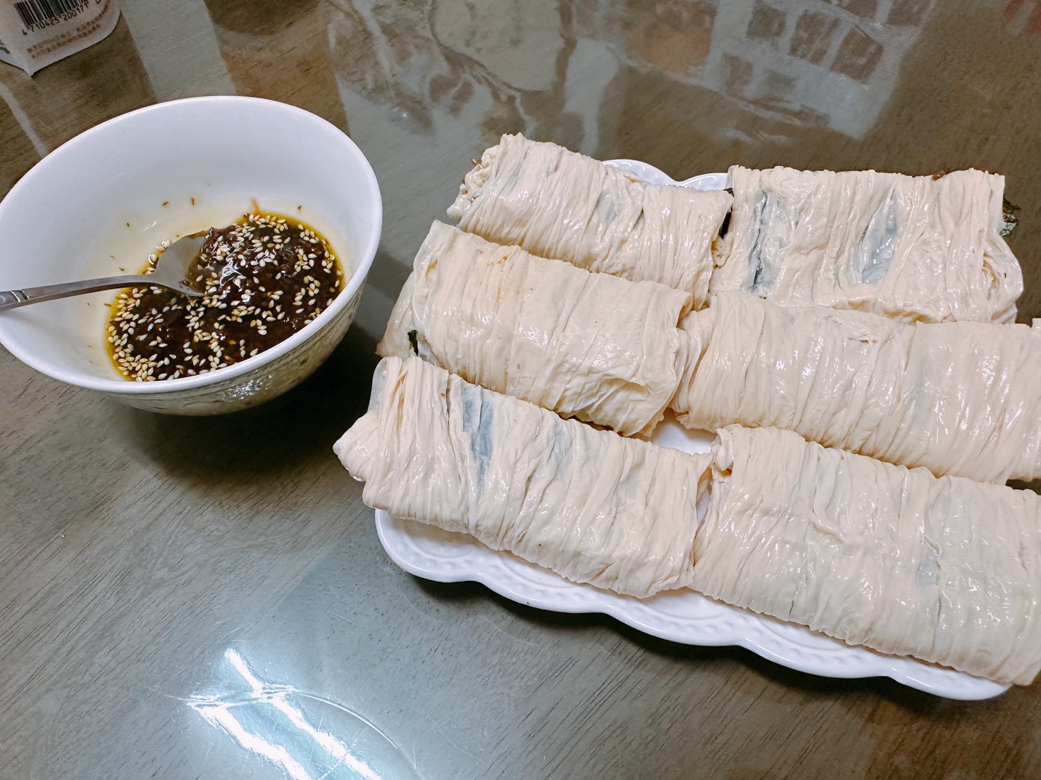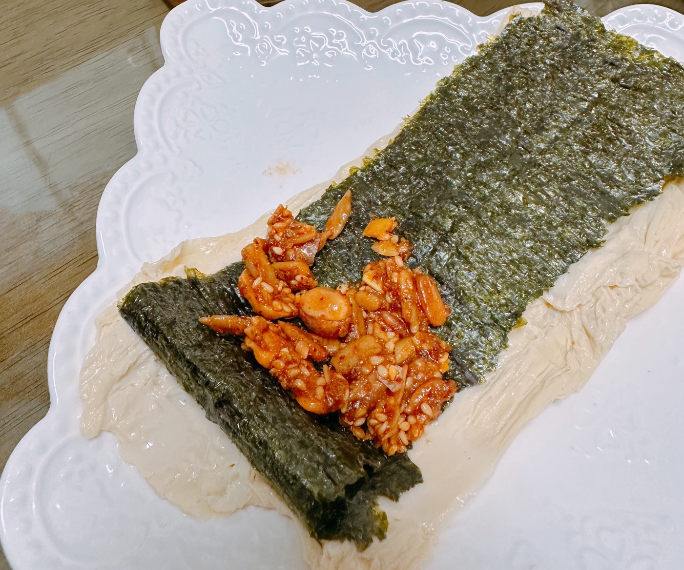 〔食材〕 豆包 ️里仁燒海苔(一張剪成三小片) ️香椿醬、醬油膏、白芝麻(拌在一起成為拌醬) 麵粉 蔬果烏醋 〔作法〕 1. 豆包打開,抹一些麵粉水,黏上一張海苔抹上拌醬,將豆包捲起來。 (拌醬也可以改用堅果醬如以下照片,吃起來更具香氣喔!) 2. 加油煎香 3. 加入少許〔醬油膏、蔬果烏醋、豆瓣醬) 4. 小火煮到收汁即可 。 小小試吃員一上桌,原本很不適應香椿的味道,但看到金黃酥脆的豆包卷還是忍不住嚐了一口,接著整塊吃個精光,連忙比讚呢!
