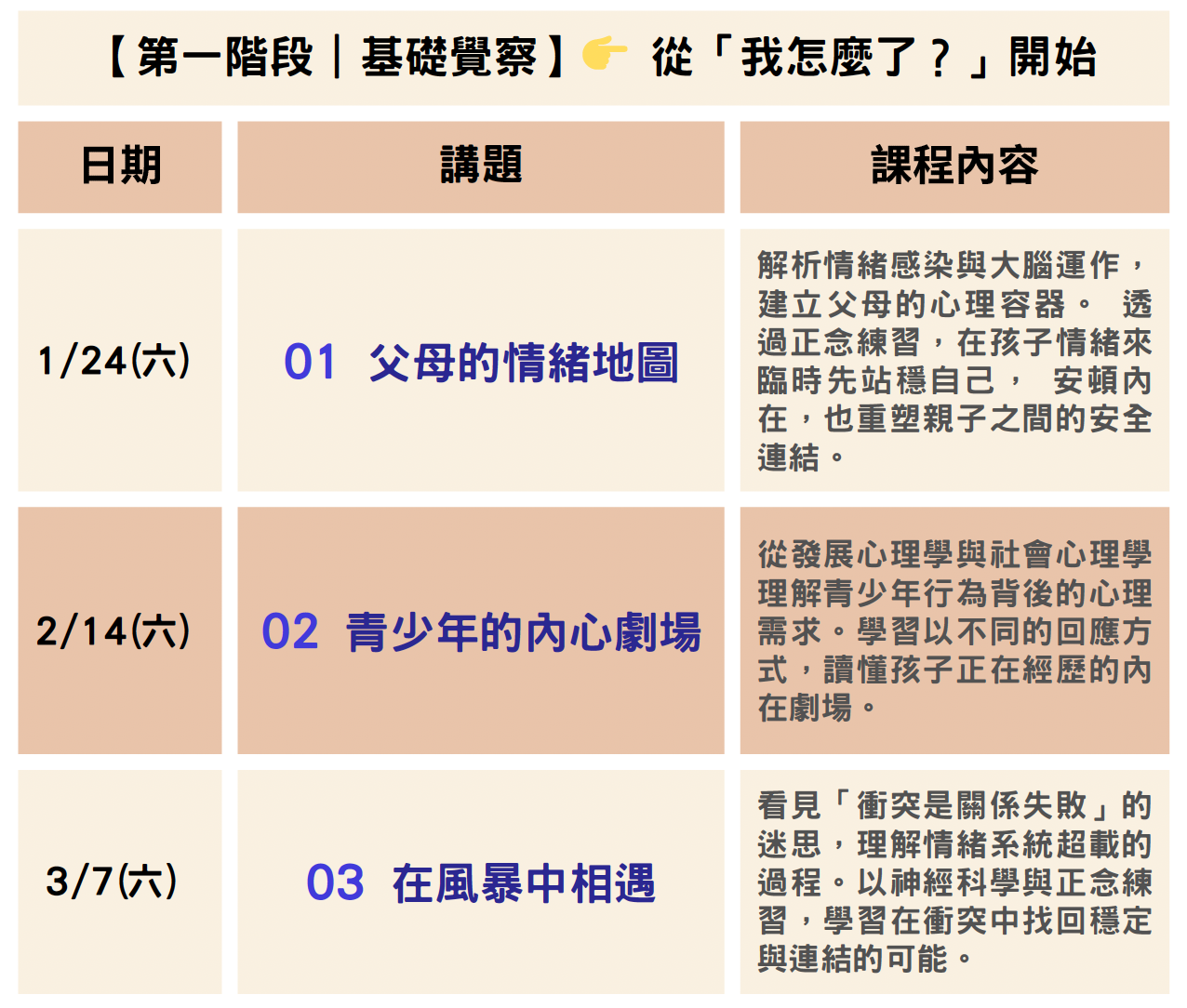 課程不急著「修正孩子的行為」,而是陪伴父母先穩定自己,成為孩子在風雨中可以依靠的「安全基地」。